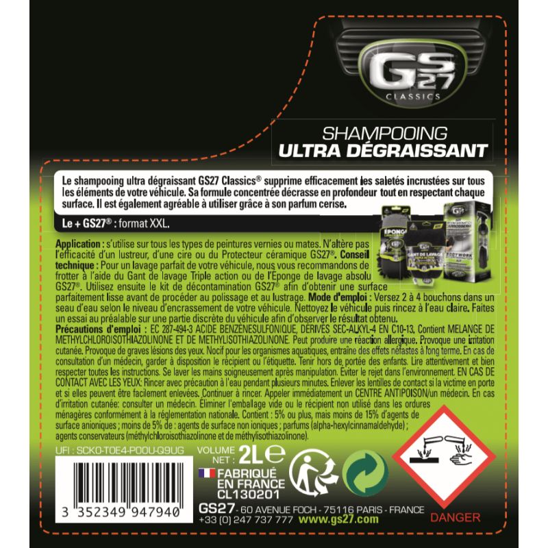 Le shampooing ultra dégraissant GS27 Classics® désincruste sans effort les saletés ainsi que le film routier sur tous les éléments de votre véhicule.